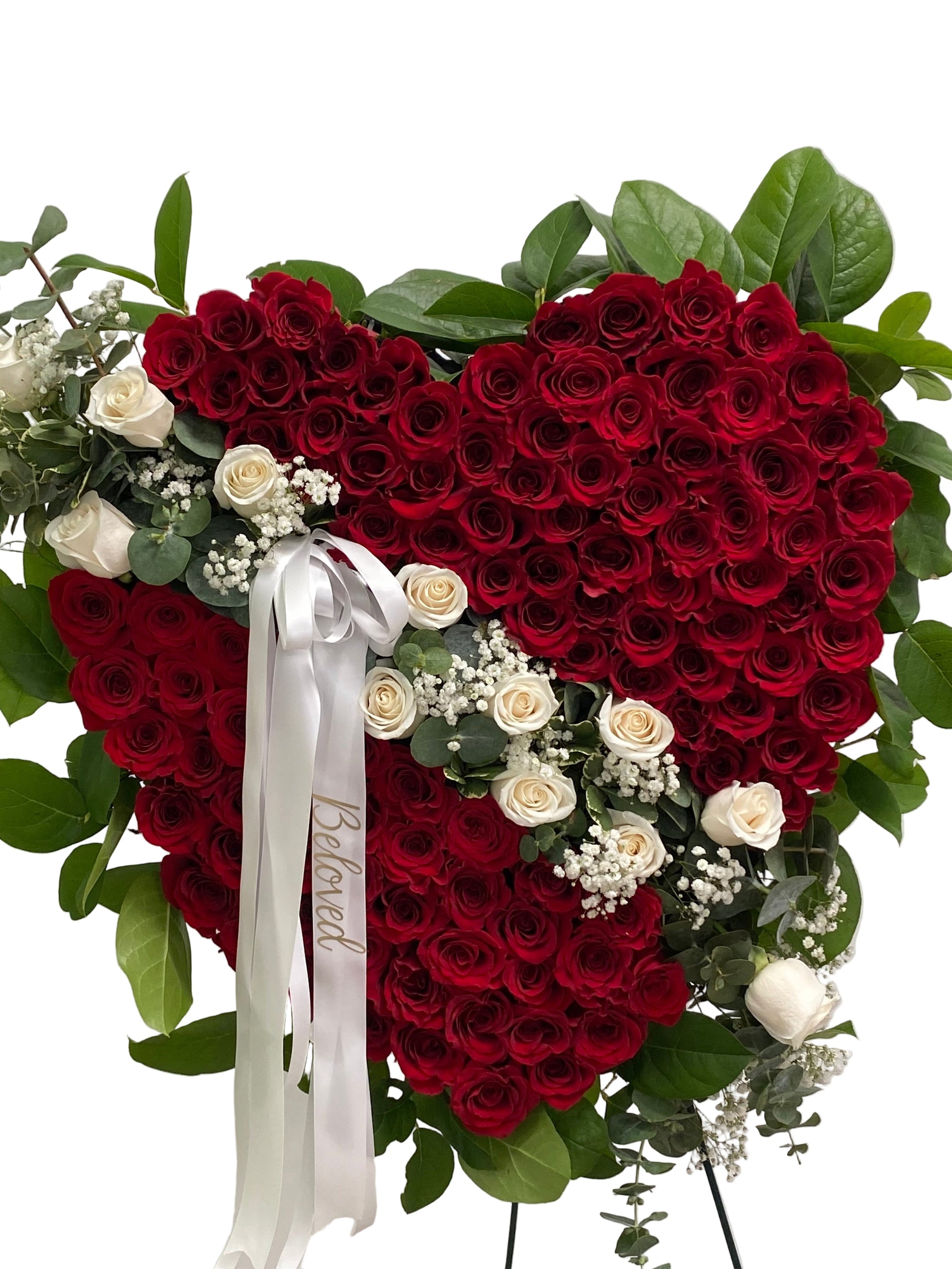 Honor someone dear with a graceful and heartfelt tribute. This standing heart arrangement features vibrant red roses, complemented by a flowing spray of white roses and finished with a soft white satin ribbon. It’s a beautiful and elegant way to convey your love, respect, and deepest sympathy.